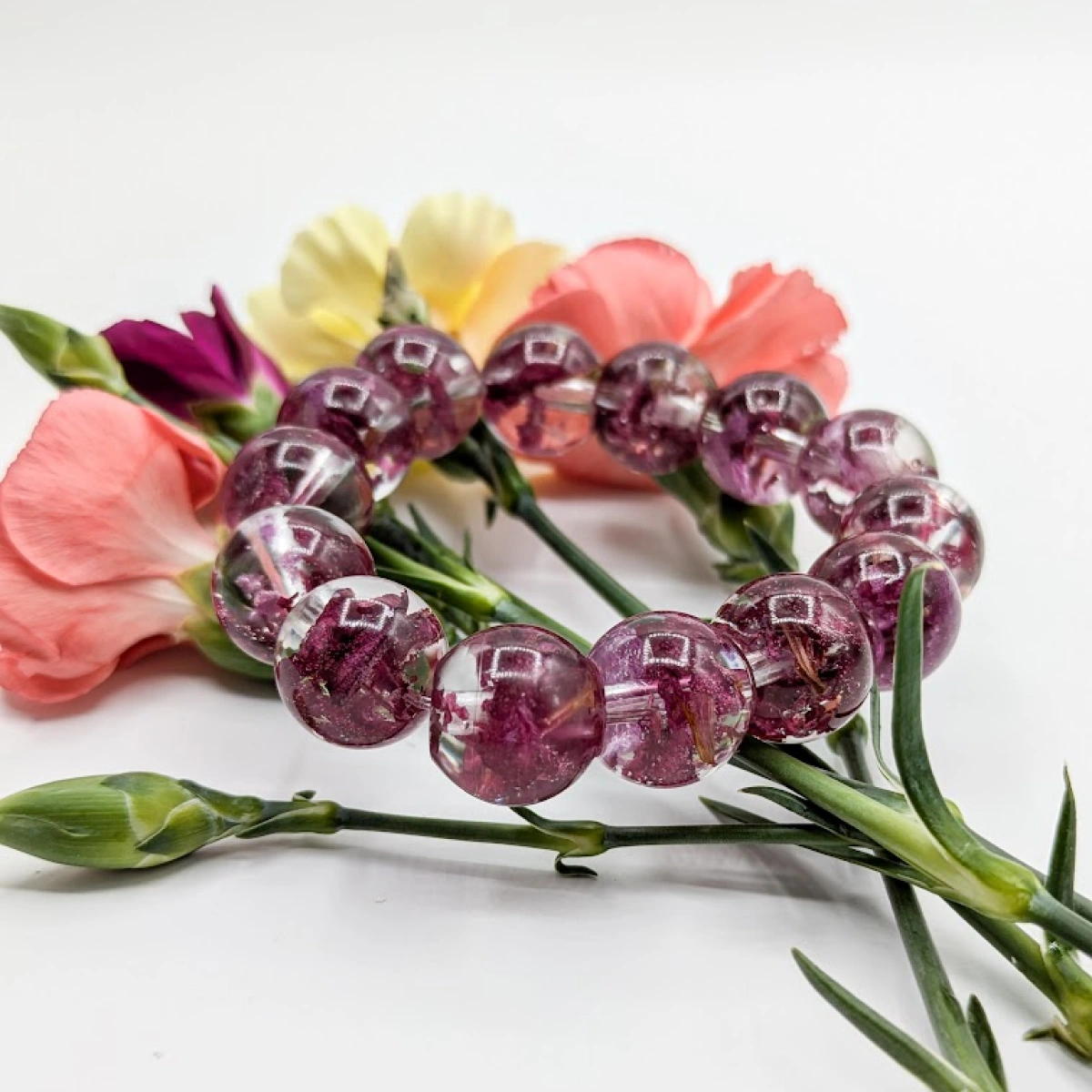 Živé květy, když se zalijí křišťálovou pryskyřicí, uvolňují vzduchové bublinky. Ve šperku se tedy občas mohou objevit bublinky, které se tvoří při tvrzení pryskyřice. Korálky vlastní výroby plné květin tyto bublinky mohou mít i na povrchu. Není to pravidelem, ale v každém náramku takový korálek najdete. Těmto bublinkám nelze předejít. Pryskyřice se vytvrtuje 48 hodin a všechny bublinky nelze eliminovat.